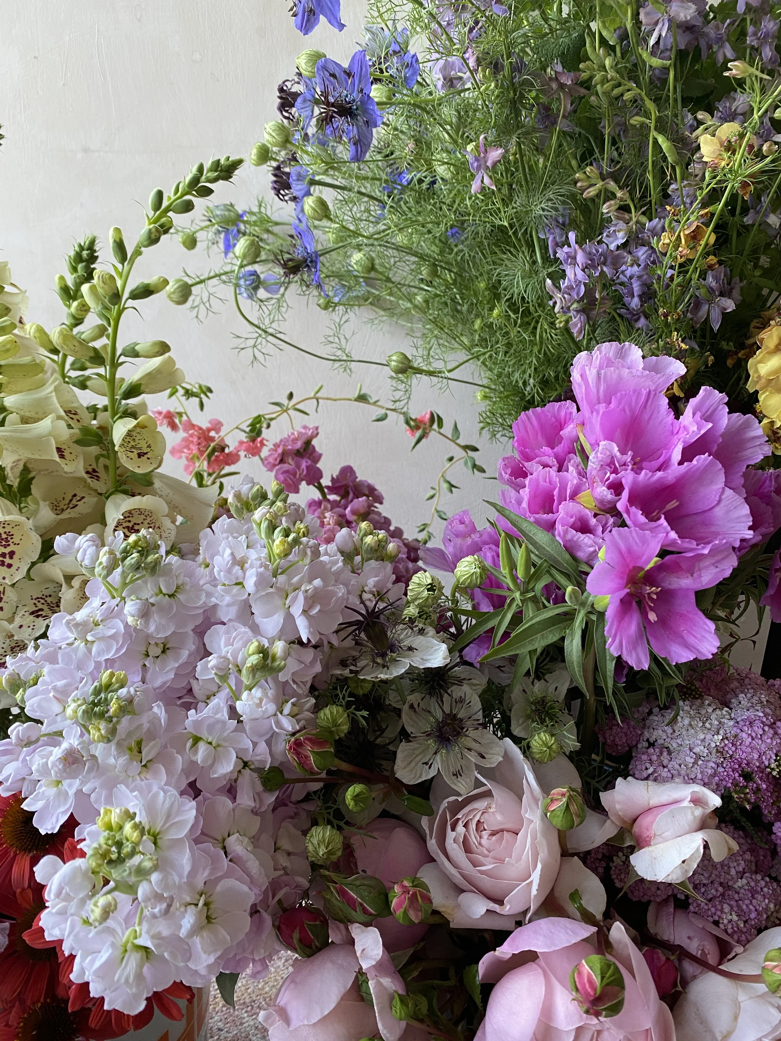 Alcalthaea suffrutescens 'Parkallee' Lisianthus 'Falda Yellow', 'Pucchino Choco', 'Celeb Apricot' and 'Grace Lavender' with Phlox 'Cherry Caramel' and some dried Allium seed heads.
